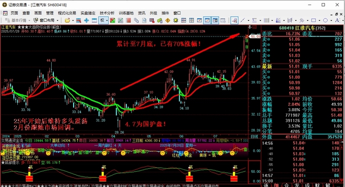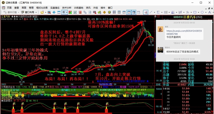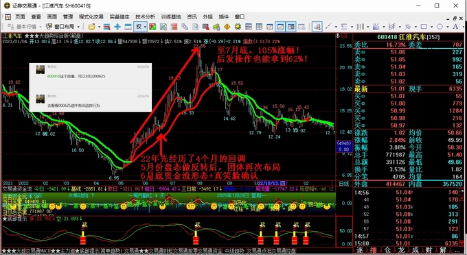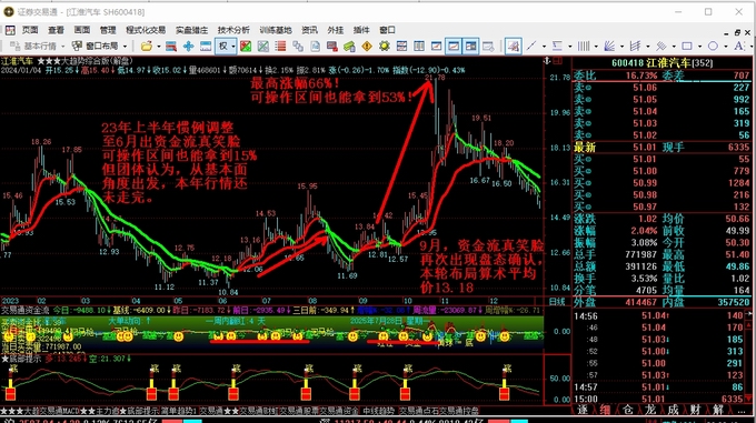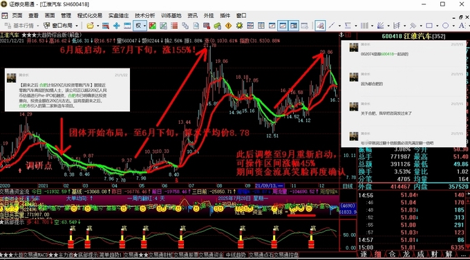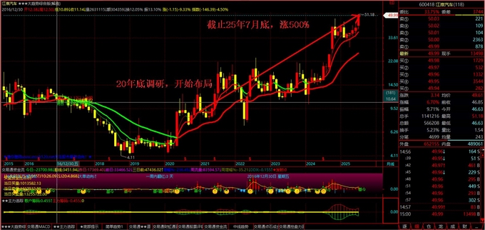 好标的的标准是什么?能涨,能上车。这应该是大多数人心目中的好标的。 今天我们来看一只连续5年,除了中间沉淀的23年,每年都能拿到至少100%涨幅的好标的。这只标的是会长为VIP群的成员们特地精选的。 首先从基本面开始。先问大家一个问题,新能源汽车是什么时候为大家所广泛接受的?20年开始。从那年开始,新能源汽车不再是一种新奇的交通工具,而是人们的一个正常的选择。一个明显的数据证据就是从20年开始,新能源汽车在汽车保有量里的占比快速上升。直观上,我们站在马路边,绿牌的小车越来越多,在某些场景里,甚至占了大多数。行业分析也是同样的结论。 大潮之前,必然要去冲一冲潮头。 在这样的背景下,团体对包括600418这只最终选定标的在内的多只新能源汽车概念标的开展调查研究。自布局开始,截止7月底,这只标的 涨幅达到500%! ![]() 2020年底,在多轮精选诸多个标的的前提下,会长将目标聚焦至600418上。这只标的在当年的6月启动,至12月已经达到了翻倍的成就。 ![]() 2021年1月下旬,团体开始布局。至6月,标的维持窄幅震荡,期间算术平均价8.78。交易通软件出连续底部指示。行至6月底,标的启动,一个月的时间,涨155%!调整至9月,标的再次启动,资金流真笑脸确认,按保守可操作区间计,45%涨幅到手! ![]() 2022年,标的开始调整。经过4个月的充分调整后,价格回到了6元左右。5月份,盘态做多空反转。团体再次布局,经过6月份交易通资金流形态+真笑脸确认,105%涨幅到手。即使以确认为起点做后发跟随操作,也能拿到62%的涨幅! ![]() 从现在的眼光来看,2023年其实是600418这只标的的沉淀期。年初开始后同样调整。至6月出资金流真笑脸,到转多的盘态结束,可操作区间拿到了15%的涨幅。但团体从基本面出发,认为当年的行情还未结束。果然到了9月份,交易通资金流真笑脸,并且再次出现盘态上的确认,团体再次布局。本轮布局区间算术平均价13.18,最高涨幅66%,可操作区间也能拿到53%! ![]() 时间进入2024年。年初继续前三年的模式,但行至2月,异常出现。标的从10元左右转多,最高涨至19,后回落至15左右。之后维持窄幅震荡,同时交易通同时出现连续底部指示和连续资金流真笑脸。团体判断,本年度这只标的应当要出一波大的行情,因此在此期间,团体布局,布局,再布局!至7月,盘态向上突破,至10月,标的起飞走独立行情。自团体布局区间算术平均价起算,最高180%涨幅,按可操作区间保守计算,也有150%涨幅! ![]() 2025年,标的维持多头震荡。行至4月,受外部消息影响,市场突发下跌。团体在为国护盘行动中,当然也没有忘记这只标的。截止7月底,该标的已有70%涨幅,且盘态强多,又不知今年能涨到多少呢?