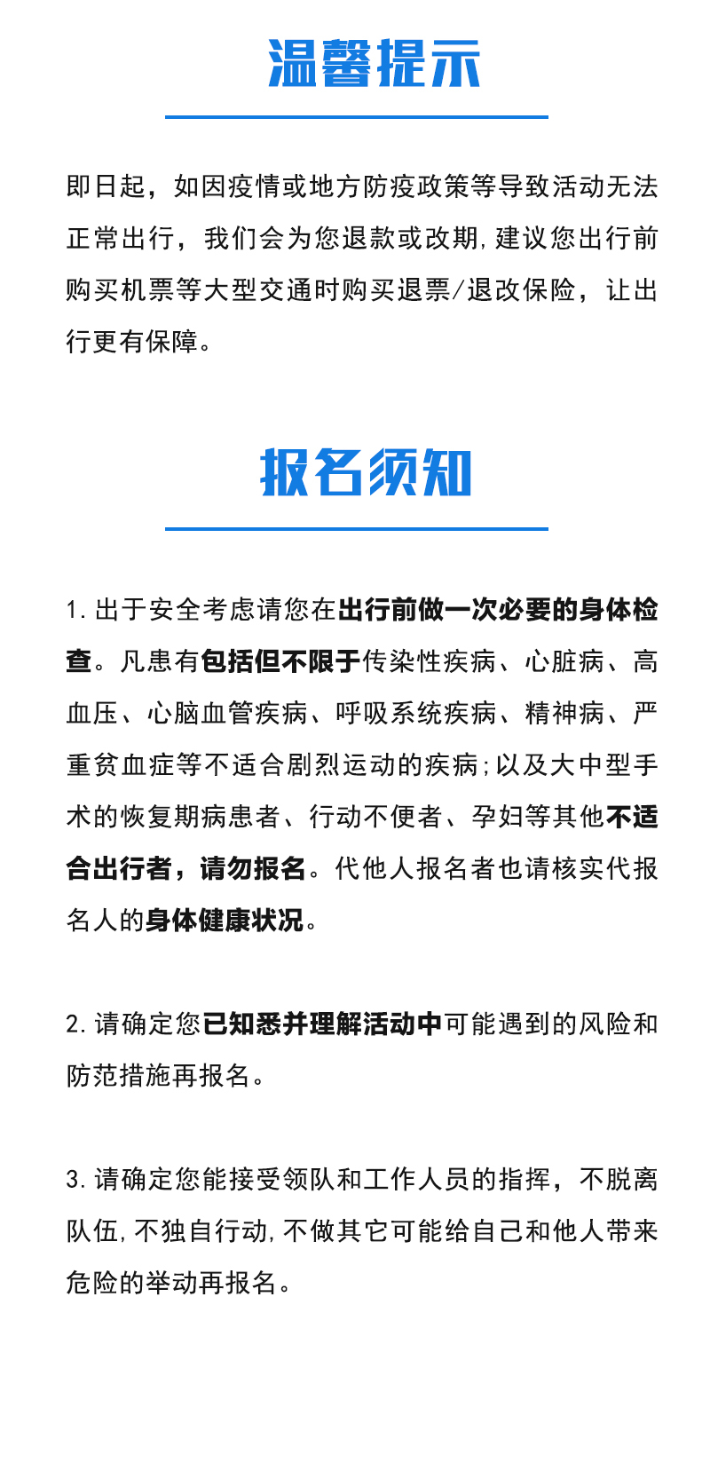 9、关于报名: (1)凡有传染性疾病、心血管疾病、脑血管疾病、呼吸系统疾病、精神病、严重贫血病、大中型手术的恢复期病患者、行动不便者、孕妇等,以及其他不适合出行者,请不要报名。代他人报名者也请核实代报人的身体状况。如果报名者或者代他人报名者隐瞒身体状况,造成的后果,由自己承担; (2)报名需提前询位确定,支付活动费,报名成功以支付活动费用为准。支付活动费用后请告知客服人员查询,并确认报名信息。 【退款说明】 1、活动开始前10天退出,活动费用或定金可全额退返,或延期到下一次活动使用; 2、活动开始前7-9天退出,需扣除30%活动费用,余款予以退还; 3、活动开始前4-6天退出,需扣除50%活动费用,余款予以退还; 4、活动开始前3天内退出,定金不予退还; 5、活动开始后,因个人原因退团,只退还未产生的门票以及餐费; 6、疫情原因无法出行,请提供相关部门证明,可以全额退款。 7、国庆节活动开始前7天内退出,定金不予退还。 领队亮仔 微信电话:18284592335 |