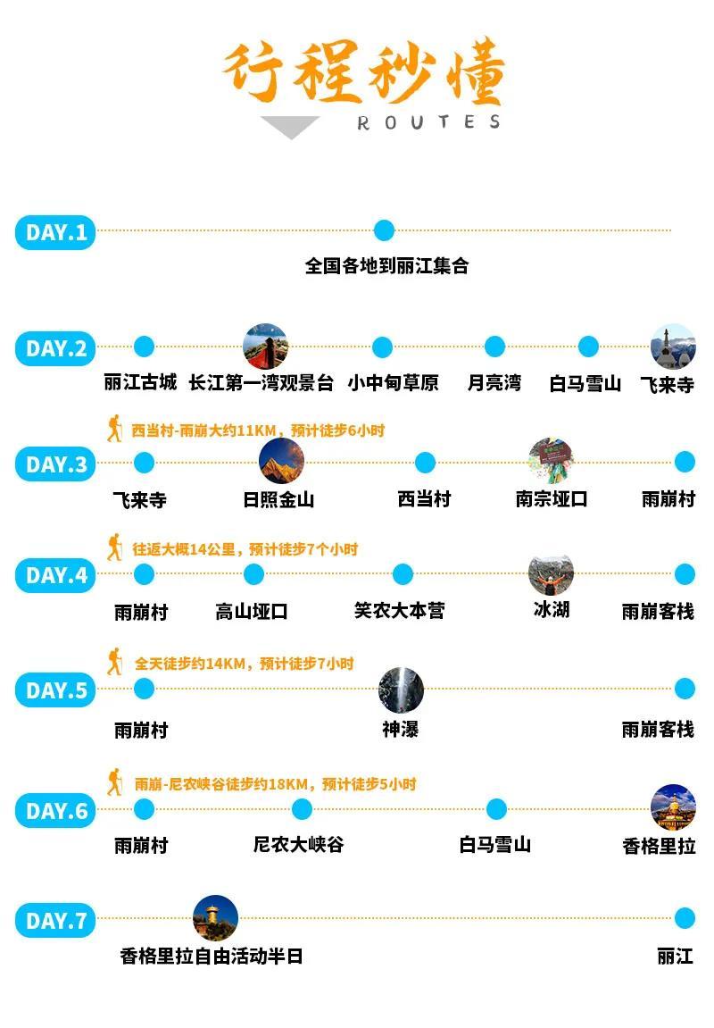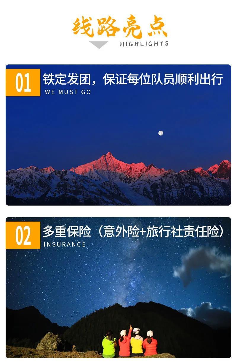 活动介绍![]() ![]() ![]() ![]() ![]() ![]() ![]() ![]() ![]() ![]() ![]() ![]() 梅里雪山处于世界闻名“三江并流”地区,主峰海拔6740米,是人类至今未能征服的“处女峰”,是众山之神。 特殊的环境和气候,使梅里雪山常年云雾缭绕,即使冬季无雨的日子,当地居民都很少能见到她的真容。能看到梅里的日照金山,更是很多人一辈子的心愿。 这儿有着800多年的转山历史,是藏区人们心中的圣地。他们会以徒步行走的方式去朝拜山中的圣地,这是一种盛行于藏区的宗教活动,他们称之为“转山”。 梅里这条终年积雪的雪山群,绵延150多公里,海拔超过6000米的山峰多达13座。梅里雪山是雍仲苯教的圣地,在藏民心中有着很高的地位,是国内最为经典的户外徒步活动的地方。 我们遵从藏族信徒转山的走法,设计了梅里雪山雨崩徒步旅行活动,最大可能的再现“转山”这一独特而神秘的活动,并尽可能全方位的欣赏梅里雪山的冰川、峡谷、瀑布、原始森林美景。 雨崩位于梅里雪山的念慈母峰下五子峰脚下,植被茂密奇特,因其地理环境独特,所以人烟稀少,民房零零散散分布着,这里景色优美,民风淳朴。这处绝佳的秘境,从前还只有一条人马驿道与外界联系。一年四季,这座藏在梅里雪山深处的藏族小村落撩拨着许多旅行者的心弦。 行程安排D1:全国各地-丽江 从全国各地自行前往丽江,可游览丽江古城,感受这座高原城市独特的浪漫,晚上入住我们赠送的酒店。(旺季7.10-8.25;国庆9.27-10.5不赠送;春节团期不赠送)。