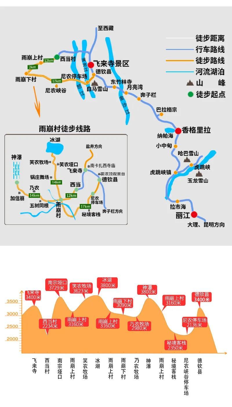 D3:飞来寺-日照金山-西当-南争垭口-雨崩村 根据当天日出时间,我们需要提前起床前往【梅里雪山观景台】欣赏一生难得一见的神奇梅里日照金山,之后乘车前往【西当】(注:途中将路过巴玖寺,这里是藏族人传统转山取“开山钥匙”的地方,如果大家的体能有保障,并且在天气和时间允许的情况下,我们将前往巴玖寺取钥匙),从西当开始徒步进入与世隔绝的雨崩村落。爬升海拔1200米到达【南争垭口】后一路下坡,在夜幕快要降临之前到达【雨崩村】,朴实却有特色的藏式小房子将会呈现在你眼前。 如果小伙伴中体力弱较弱的可以选择从西当乘车进雨崩(西当到雨崩200元/人)若需乘车的客人,请一定注意安全,且费用、安全等问题由客人自行负责。 需时:徒步约11KM,约6小时