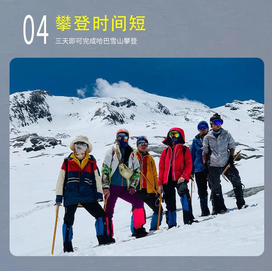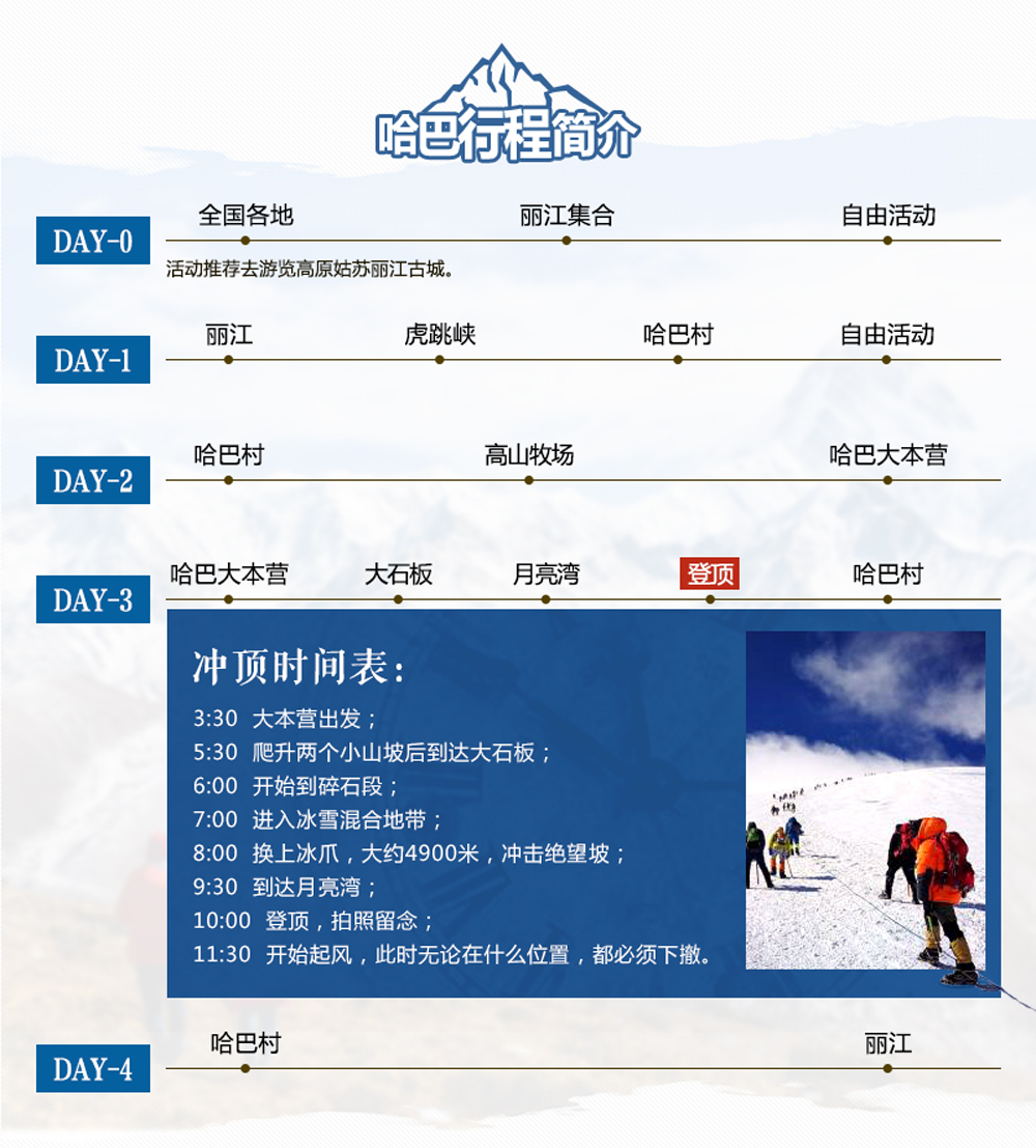 D3:哈巴大本营-大石板-月亮湾-登顶-哈巴村 凌晨3:00起床,整理行装、检查个人装备, 3:30吃早餐,4:00跟随向导协作有序向顶峰进发。登顶成功(正常时间为9-10点之间)后请尽快在峰顶拍照,不要在峰顶停留过长时间,然后在向导及高山协作的带领下下撤返回大本营。抵达大本营后,稍作休息,收拾物资装上骡马,下撤到哈巴村。 注意:登山过程中,如遇到身体不支的队员,请及时告知向导或高山协作队员,由高山协作队员带其撤回大本营;今天体力消耗较大,可提前预定下山骡马(安全及费用自理)。 冲顶时间表: 3:30 大本营出发; 5:30 爬升两个小山坡后到达大石板; 6:00 开始到碎石段; 7:00 进入冰雪混合地带; 8:00 换上冰爪,大约4900米,冲击绝望坡; 9:30 到达月亮湾; 10:00 登顶,拍照留念; 11:30 开始起风,此时无论在什么位置,都必须下撤。
