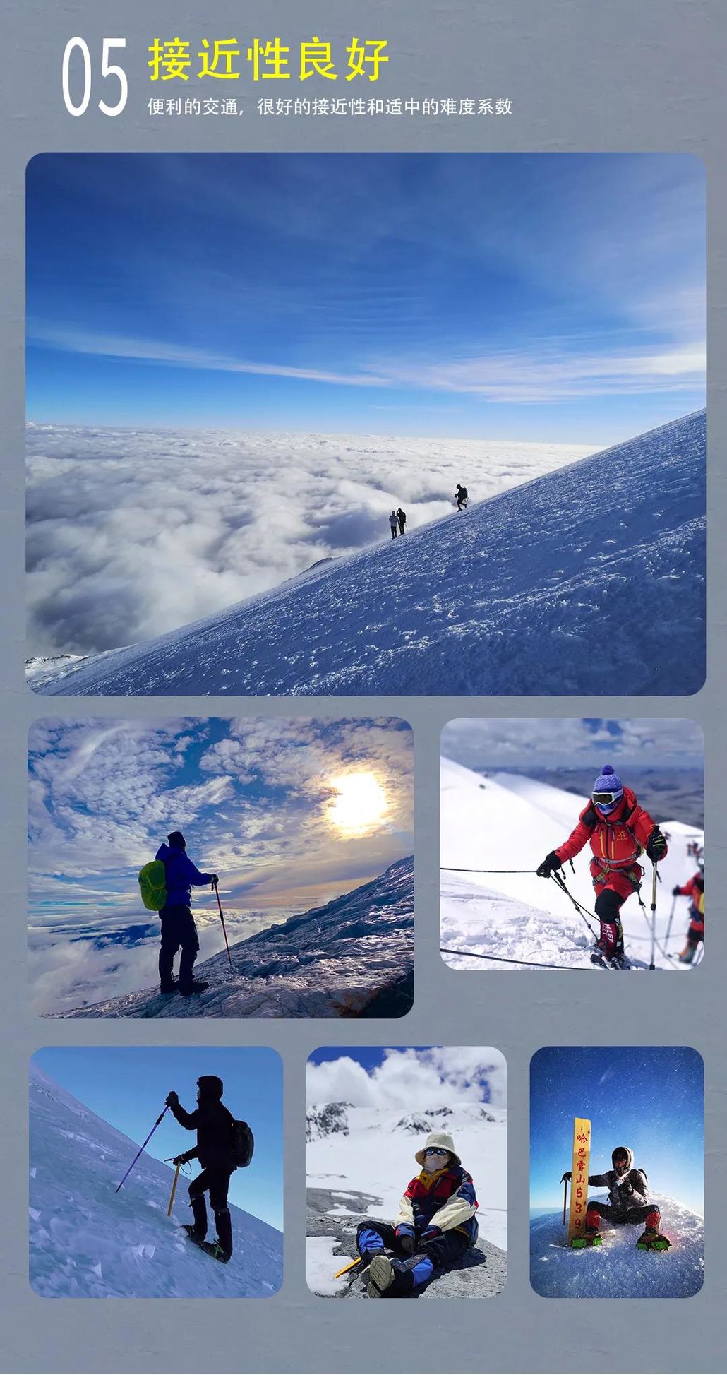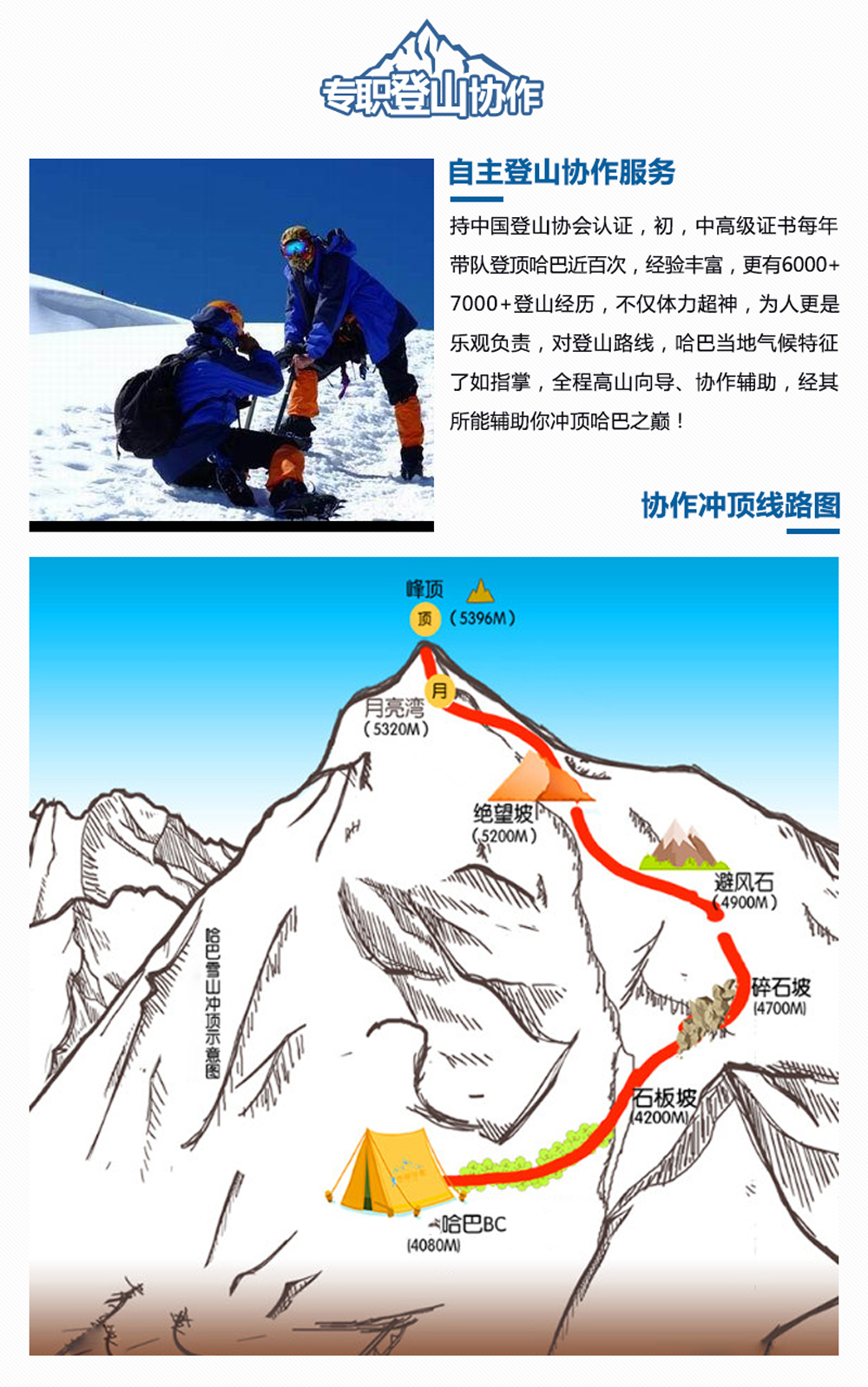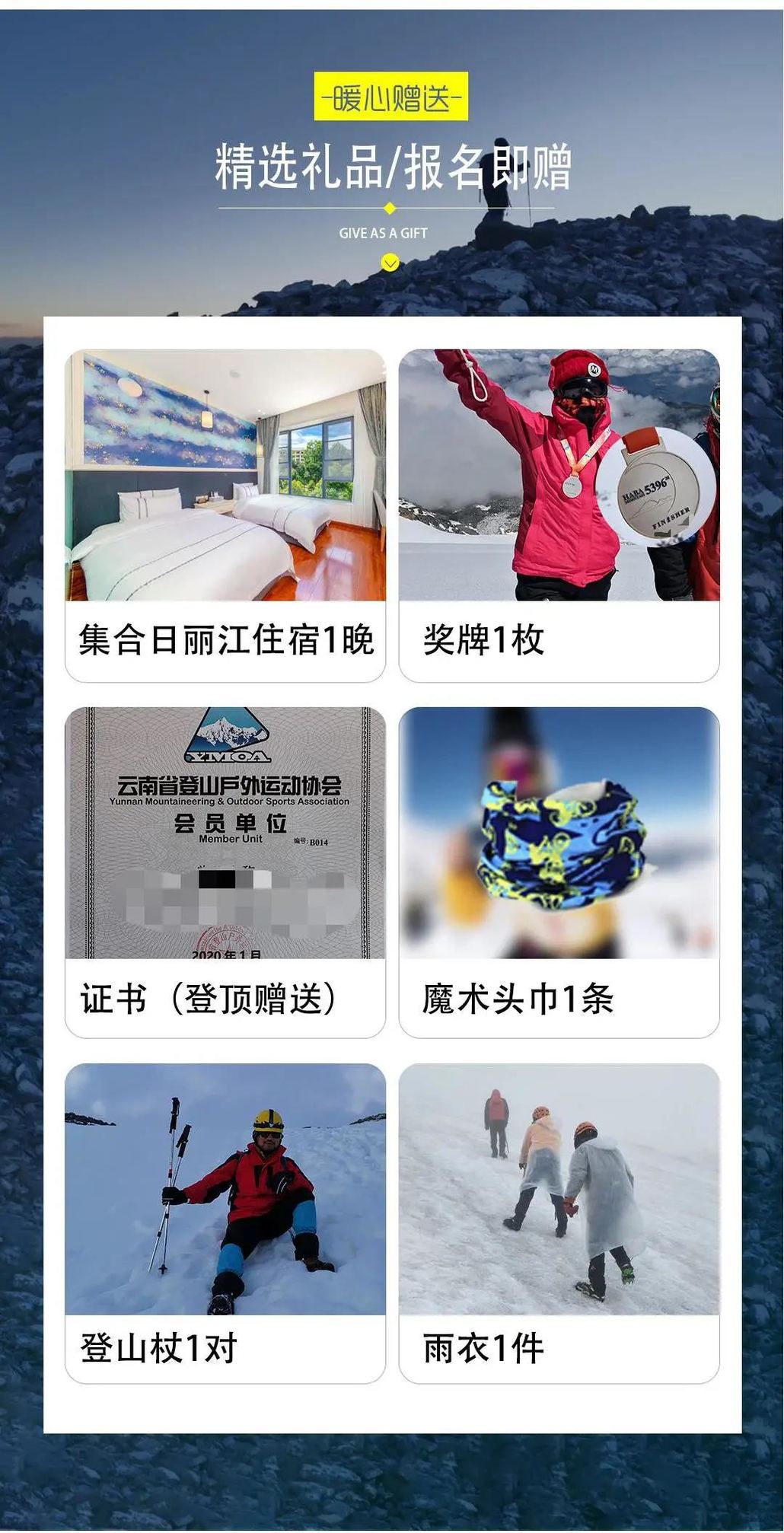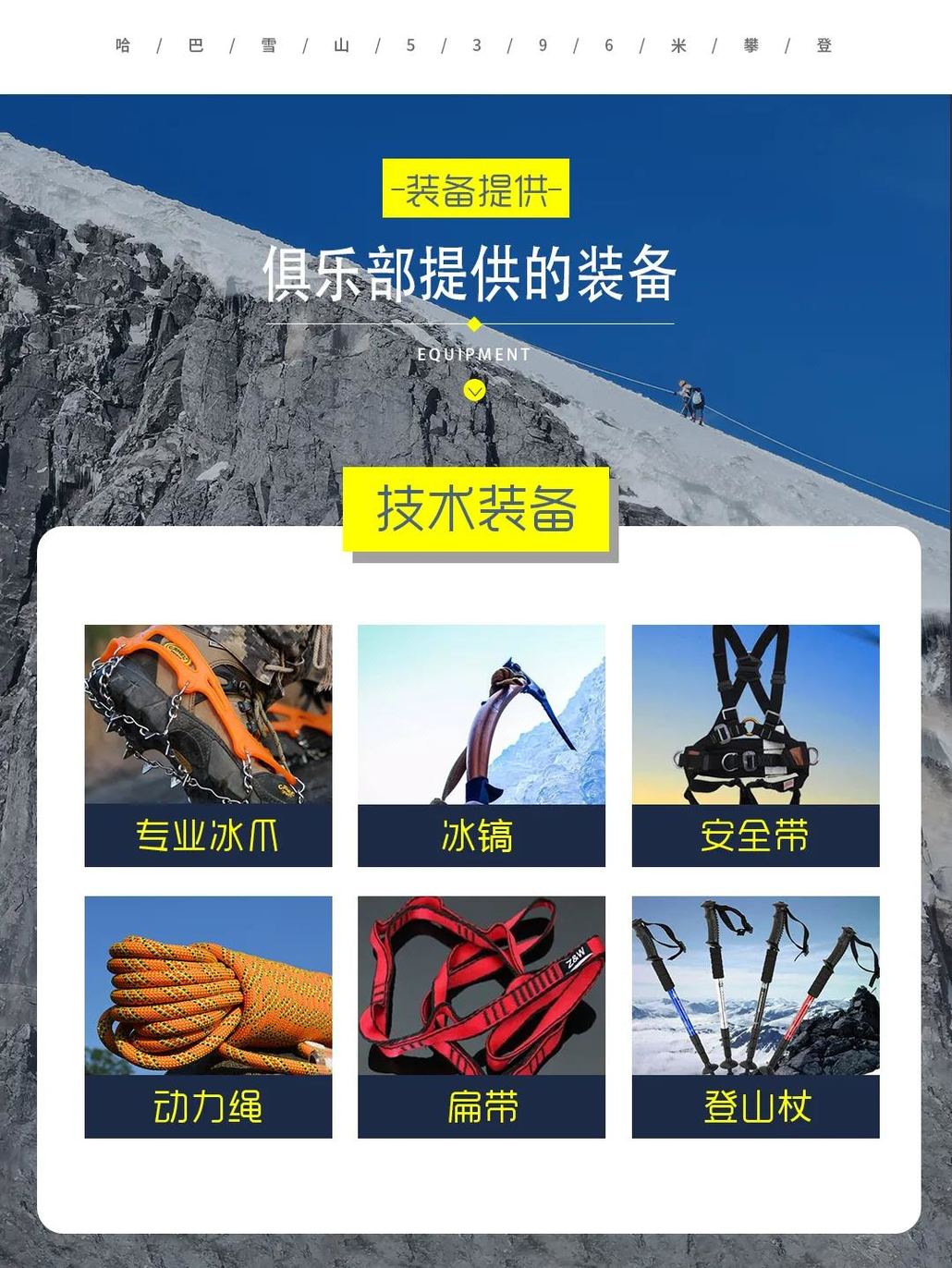 费用说明【费用包含】 1、交通:丽江到哈巴往返交通费用; 2、住宿:包含哈巴村2晚、哈巴大本营1晚住宿费用; 3、门票:虎跳峡门票,进山门票,注册费,环境保护费; 4、用餐:哈巴村晚餐2次、早餐2次;大本营早、晚餐各1次; 5、马匹:包含哈巴村到大本营驮运食品,装备的托运费; 6、协作:专职登山协作费用; 7、向导:俱乐部高山向导; 8、培训:报名后线上培训费、登山前装备使用培训; 9、保险:代办户外专业登山保险 ; 10、装备:包含活动所需要公用装备,药品,燃料及其他公用设备。 【费用不含】 1、往返丽江大交通; 2、登顶队员需支付协作小费200元/人(1V1); 3、以上报价不含发票开票费,如需要发票需加4%手续费; 4、个人消费及“费用包含”中未提及到的费用。 【赠送福利】 1、登山杖每人2根、矿泉水每人1瓶、一次性雨衣每人1件、魔术头巾每人1条; 2、登顶成功赠送登顶证书1张; 3、赠送丽江集合日1晚舒适性住宿. 注意事项【装备说明】 【俱乐部提供装备】 1、技术装备:专业冰爪、头盔,冰镐、安全带、路绳、登山杖、动力绳; 2、宿营装备:公用帐篷(露营活动)、大本营高山炉、锅具等; 3、通讯及定向装备:对讲机,BC营地太阳能充电设备; 4、其他装备:血氧监测设备、便携氧气瓶。 【个人自理装备】 1、冲锋衣裤(防风、防水、透气、耐磨)、抓绒衣(含WINDSTOPPER,主要是防风、保暖)、排汗内衣(户外运动后保持身体干燥); 2、快干衣裤(非必需,裤管、袖管最好是可以脱卸的,用于前往大本营的途中最佳); 3、羽绒衣裤(用于登顶及大本营晚上御寒); 4、雪套(自带,也可代买); 5、雪镜(自带,也可提供租用);注意:近视眼者请戴上镜框眼镜。 6、手套(自带,也可提供租用);注意:抓绒保暖、防水性能好。 7、高帮登山鞋(有高山靴更佳)、羊毛袜2双; 8、睡袋(大本营有提供被子,可自带一个抓绒睡袋内隔或不带都行)。 【特别说明】 1、重要提示:哈巴雪山登山为高原登山活动,请大家对自己身体情况做出正确评估后以决定是否适合参加,原则上需要提供县级以上公立医院体检报告方可报名,报名前请将实际状况告知客服,如有隐瞒等情况,造成后果一律自负; 2、保险说明:均为提前代购旅游人身意外保险,如因意外产生的费用,需由队员自行垫付,活动组织方会第一时间报案,并协助后续保险程序,但不承担任何赔付责任; 3、个人财物:乘车、住宿及旅行中个人财产请自行妥善保管,若有遗失、损坏均自行承担; 4、脱团说明:提前离团需与向导签署离团协议,签署后旅行协议即终止,离队后的一切安全责任和费用均由个人自行承担; 5、赠送说明:提供雨衣登山杖各一份,不使用则无费用退还; 6、接送说明:出发集合点通常为“丽江古城大水车”,夏秋季为6点30,春冬季为7点,行程结束返回点相同,具体时间地点请以向导通知为准; 7、风险说明:高原地区由于途中车辆负荷大,可能会遇到抛锚并影响行程的情况,请游客做好心理准备。如途中遇特殊天气状况、景区政策调整等人力不可抗拒的因素(不可抗力包括但不仅限于:旅行途中发生修路、塌方、道路维修、火灾、地震、洪水等自然灾害,交通工具停运,国家政策或政府行为限制,目的地突发暴动或传染病等社会异常事件)造成的团队行程更改,则退还未去景点门票或根据实际情况更改线路安排,超支费用由游客自理。由于客人原因旅游期间未用车、房费用概不退还; 8、游玩说明:以上行程在不改变参观内容及景点的条件下,俱乐部有权作前后调整,有些地区未被开发,有些景点具有特殊性,如果想去标准行程中没有注明的地区、景点,产生的安全与费用问题与俱乐部无任何关系; 9、优惠政策:持有有效的军官证、学生证、残疾证等国家规定能减免门票的,请随身携带好相关证件,进入景区前由景区工作人员核验真实性(符合减免标准则由向导按照公司采购折扣价标准给予退还,门票优惠均不以挂牌价为准),优惠价以景区政策为准,活动结束由俱乐部统一退还差价(团体折扣价减证件优惠价); 10、客观条件:本线路沿途经济水平较为落后,整体条件较差,大本营无电无信号,自然条件恶劣,请参与者提前做好心理准备; 11、免责说明:活动参与者为具有完全民事行为能力的健康成人,且清楚明确了解细则,知道登山活动的风险,在通知和征得家人同意后方可参加本活动。活动中若遇到危险,组织方及队员均会在不危害自身安全前提下尽力救助,即使如此仍不能避免伤害产生时,参与者亦不向组织方、其他队员主张任何赔偿责任,且产生的救助费用由参与者自理,组织方协助保险理赔义务,但不承担任何赔偿责任; 12、不同于传统旅游团,俱乐部的旅行活动属于户外旅行活动,行程中无强制购物、无保姆式服务,要求小伙伴们有较好的友爱互助精神; 13、工作人员会在集合日前的第7天把参加同一期活动的小伙伴拉进活动微信群,大家可以提前交流,互相熟悉; 14、俱乐部作为活动发起方,拥有旅行活动期间所有照片、视频等素材的使用权。 【退改说明】 退订政策: 1、使用日期前10天17:00之前(含)损失费0% 2、使用日期前7天17:00之前(含)损失费30% 3、使用日期前3天17:00之前(含)损失费60% 4、使用日期前3天17:00之后(含)损失费80% 5、行程开始后,因个人原因需提前退团,需签署离团协议,并不退任何费用,敬请理解。 领队亮仔 微信电话:18284592335 |